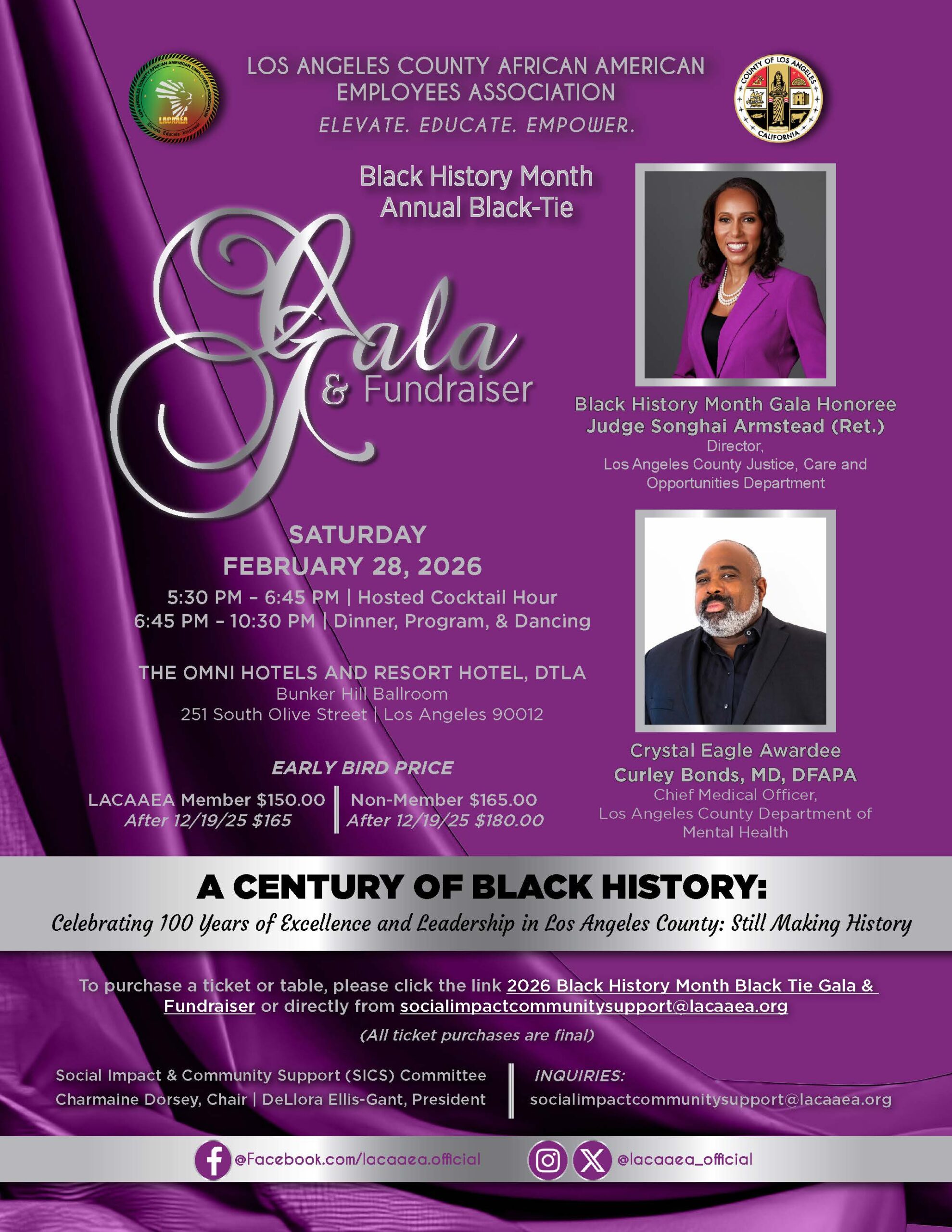 Our LACAAEA 2025 Annual Black History Month Black-Tie Gala & Fundraiser will recognize and celebrate individuals and organizations who demonstrate how they are instrumental or impactful in shaping the lives, cultures, and histories of Black Angelenos in multivariate settings such as labor in factories, the military, government agencies, public service, private homes, community social justice activists, voluntary workers serving others, institution building in churches, community groups, and social clubs and organizations. Black people’s work has been transformational throughout America, Africa, and the Diaspora. This year’s theme, “African Americans and Labor: The Past, The Present, Our Future”, sets out to highlight and celebrate the potent impact of this work.