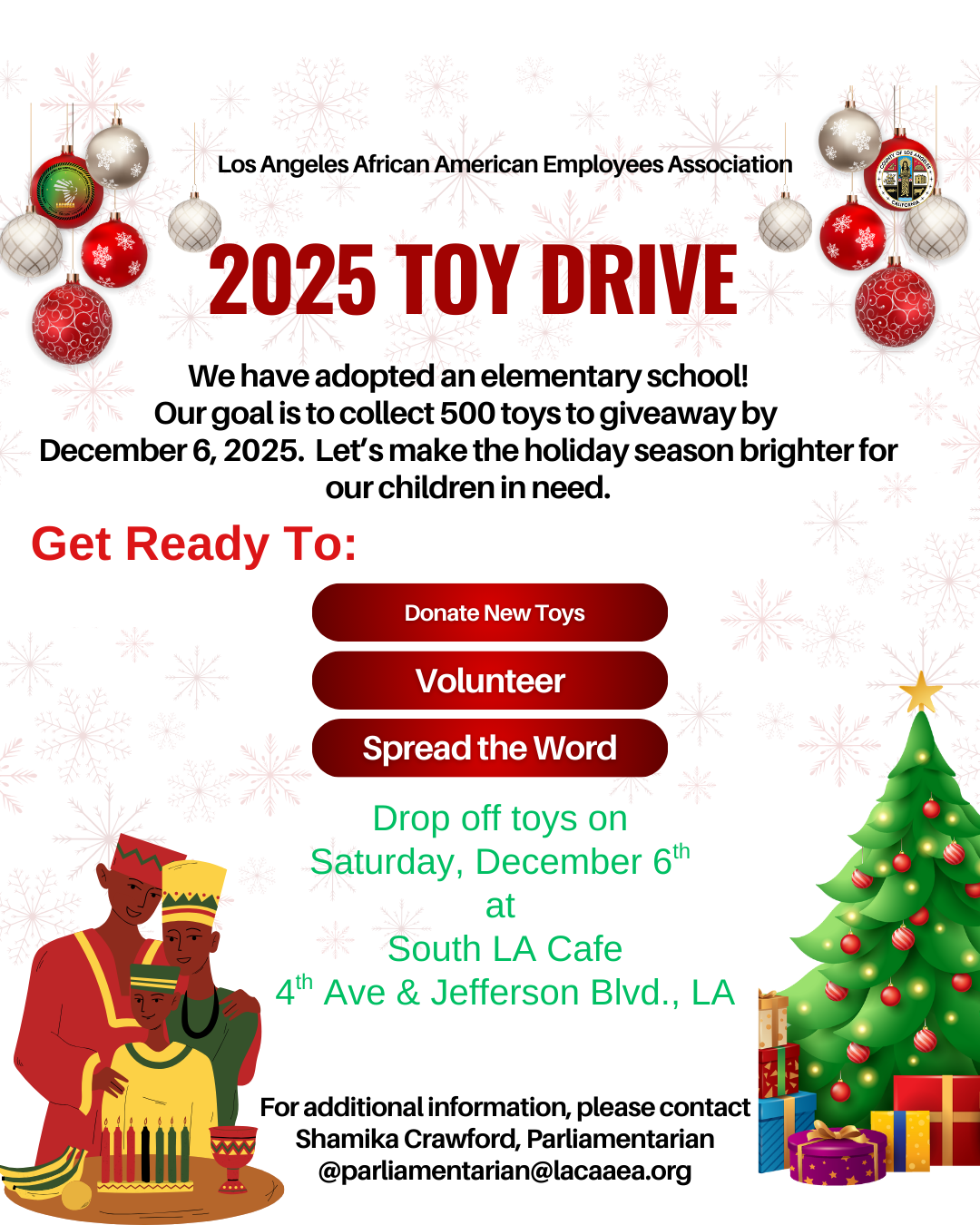2025 Toy Drive + Add to Google Calendar + iCal / Outlook export Date Dec 06 2025 Time 8:00 am - 9:30 pm Location South LA Cafe 2401 W Jefferson Blvd, Los Angeles, CA 90018 Category LACAAEA Event Share this event